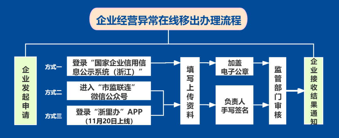 以前,被列入经营异常名录的企业想要申请移出,需要奔波在几个不同部门之间,并且一次性提供15项各类证明材料。经过此次数字化改革,这些企业在履行相关法定义务后,即可通过国家企业信用信息公示系统、“市监联连”微信公众号或“浙里办”APP,在线提交移出经营异常名录申请,真正实现了“网上办、移动办、零次跑”。