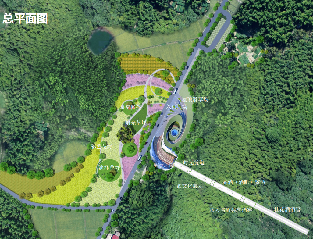 该项目通过仿星系结构进行主题设计,内部设有桂花酒文化展示、网红酒吧、储酒以及设备服务空间等功能区域。而室外则设有彩色花田、星空帐篷、演绎草坪等特色景观,致力打造融合酿酒、展酒、品酒和休闲旅游于一体的星际空间体验馆。