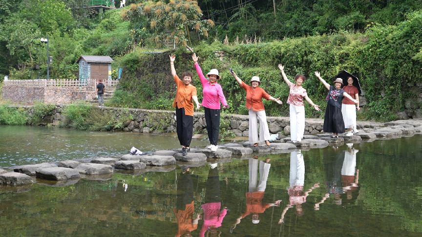 溪水涧,踮步桥上,一群正在拍照的天津游客格外醒目。这个假期,他们7户家庭相约来到乡村,体验真正的慢生活。龙淑珍阿姨告诉笔者,“‘十一’假期就想来乡村感受慢生活,对山发发呆,听听水声,吃吃美食,享受退休人的快乐生活。”溪水边,来自安徽的冯玉一家老小正在溪水捕鱼。“这边生活节奏慢,适合带老人孩子来转转,玩玩水。”冯玉说道。
