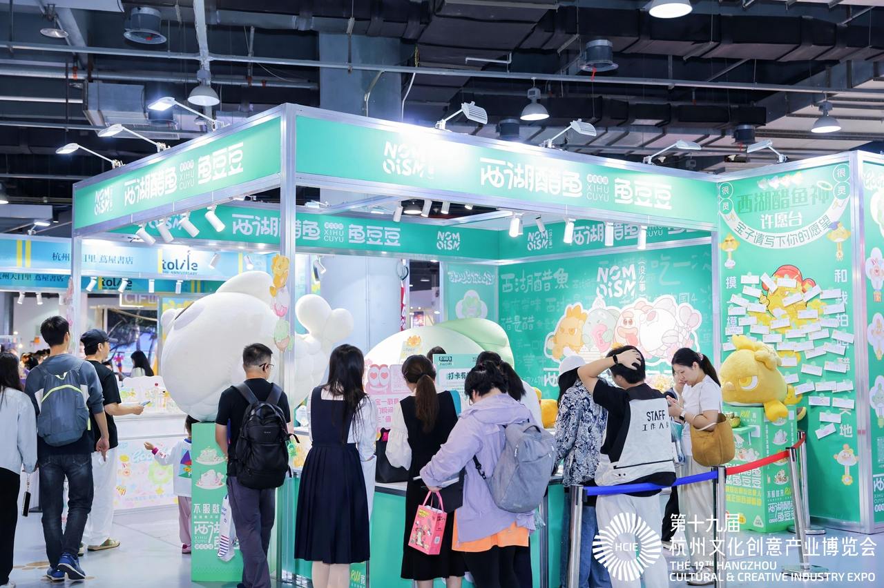 以杭州非遗美食“西湖醋鱼”为灵感打造的IP形象“西湖醋鱼豆豆”,便是本土IP成功“破圈”的生动缩影。在今年文博会上,其憨态可掬的造型,融合了地道的地域文化符号,迅速赢得了年轻群体的青睐,其中一只鱼“包豆豆”,第一天就卖出了200多只。“我们深度挖掘城市文化基因,再结合Z世代的审美趣味,让一道传统名菜也能化身为备受喜爱的潮玩。”展区相关负责人说。