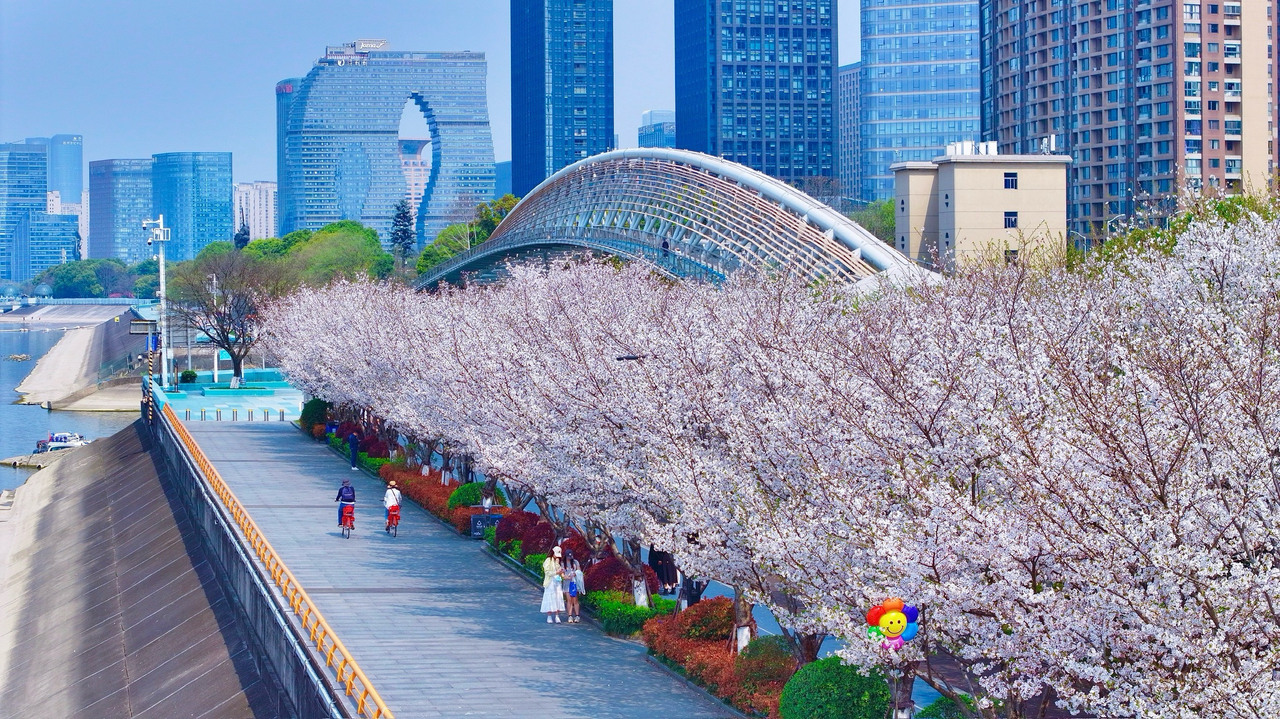 入选住建部城市更新典型案例的杭州市沿江景观带公园更新项目,就位于高新区(滨江)沿钱塘江一带,它也是人们口中的杭州“最美跑道”。“十四五”期间,高新区(滨江)对沿江的跑步道、骑行道、漫步道全面提升改造,昔日的防洪岸线,已转变为一条融观景、运动等功能于一体的绿色休闲廊道。
